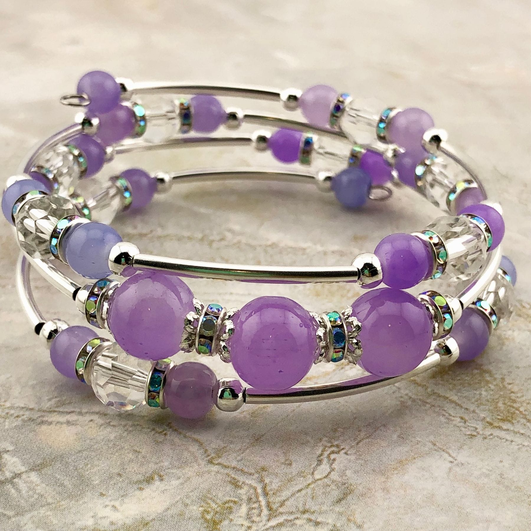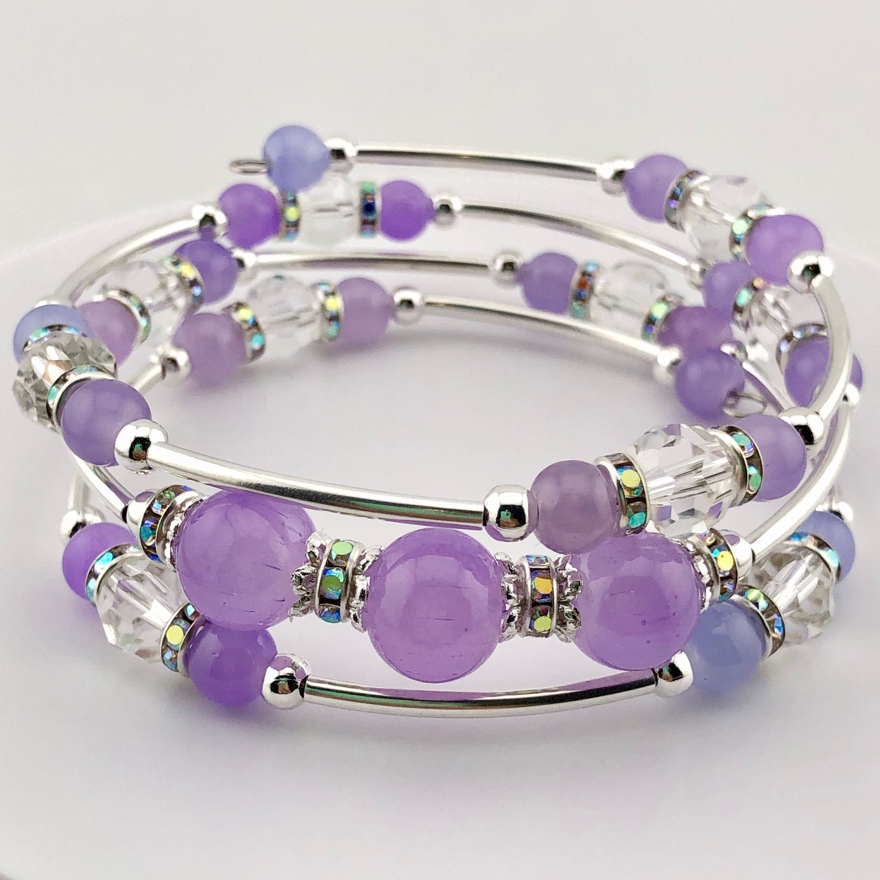 Purple/Lavender and crystal Memory Wire Bracelet with Silver tone accents