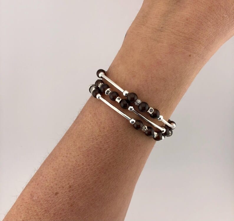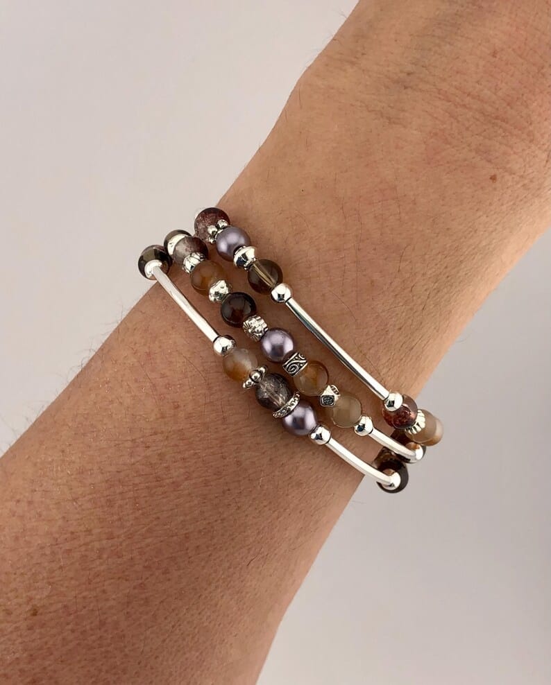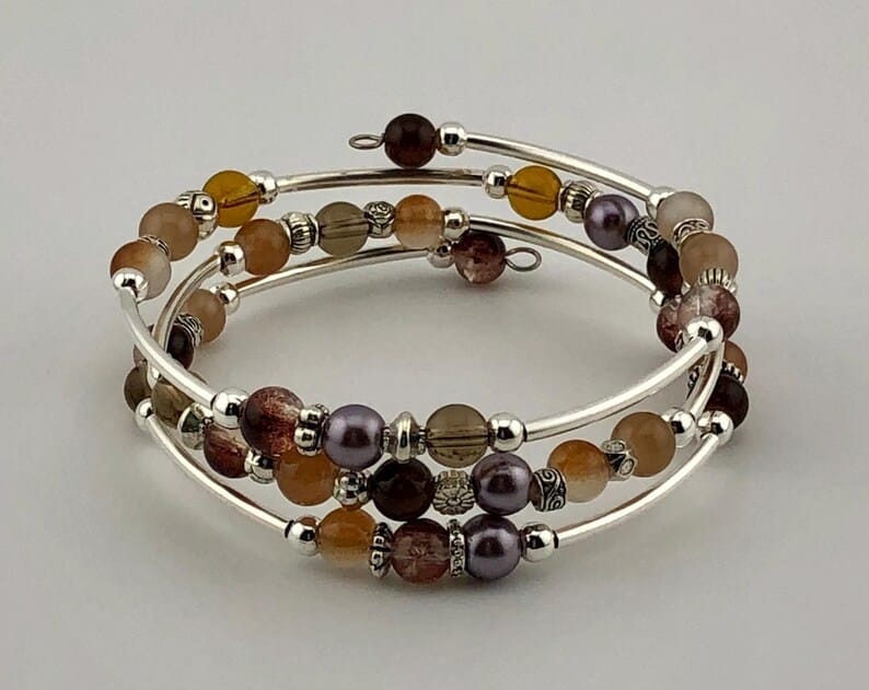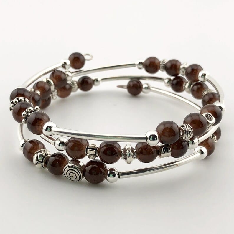 Brown Glass Bead Bracelet – Various Shades with Silver Charms & Silver Tone Accents, 3-Coil Memory Wire, Adjustable Handmade Jewelry