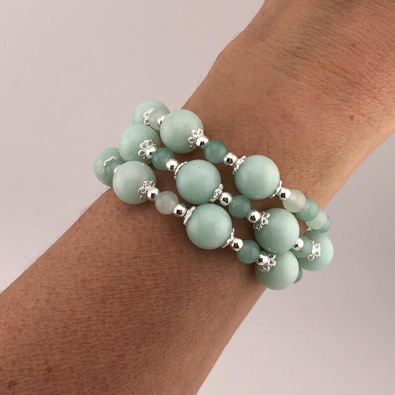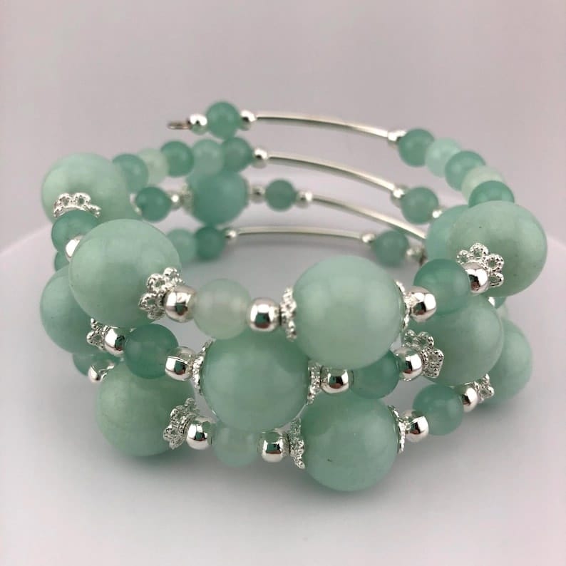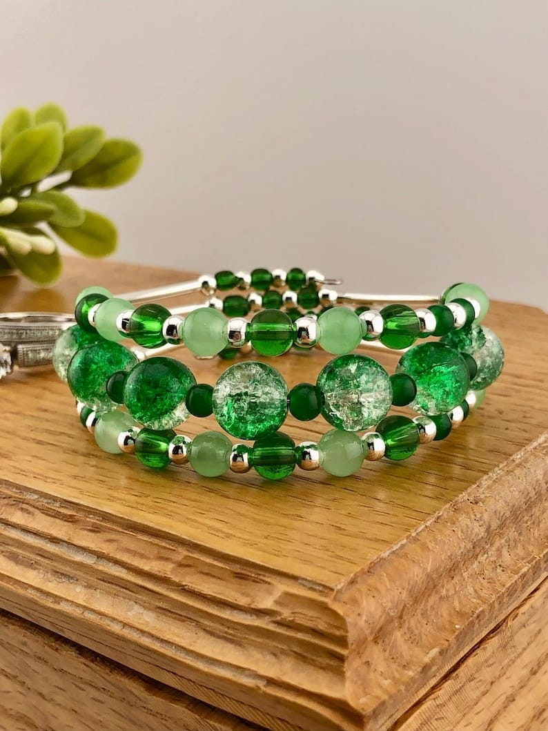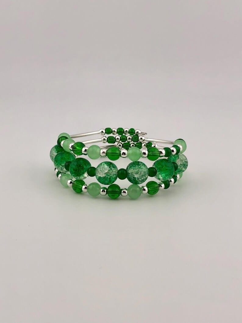 Green Glass Bead Bracelet – Various Shades with Glass Crackle Beads & Silver Tone Accents, 3-Coil Memory Wire, Adjustable Handmade Jewelry