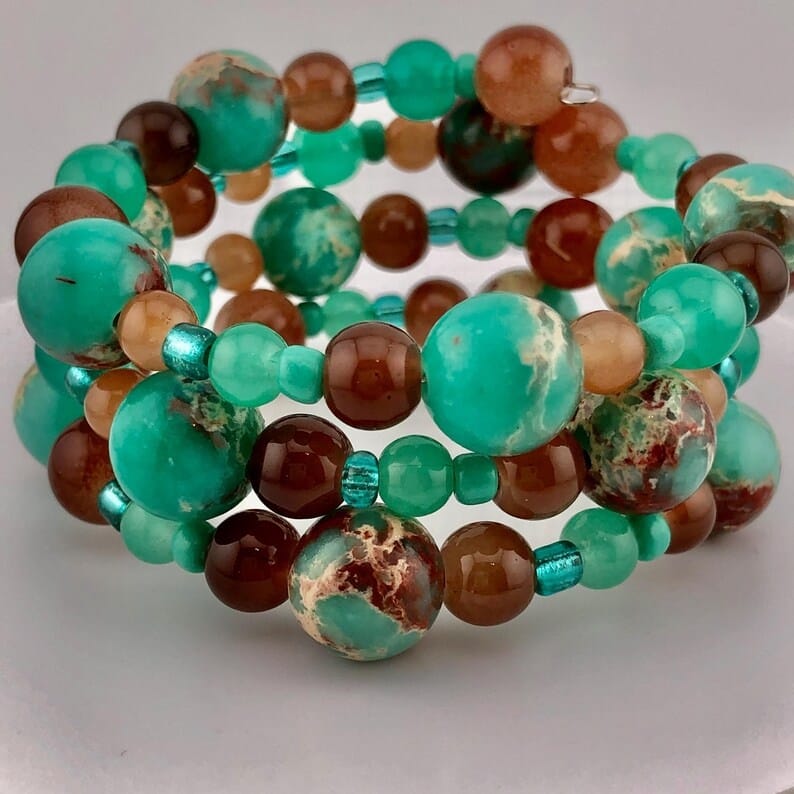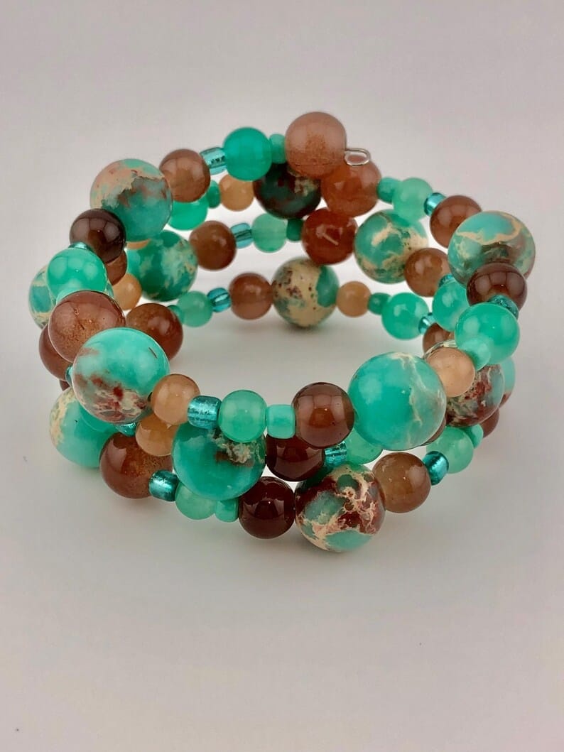 Green/Brown 3-Coil Memory wire wrist wrap cuff bracelet, Glass beaded green, blue and brown handmade unique bracelet