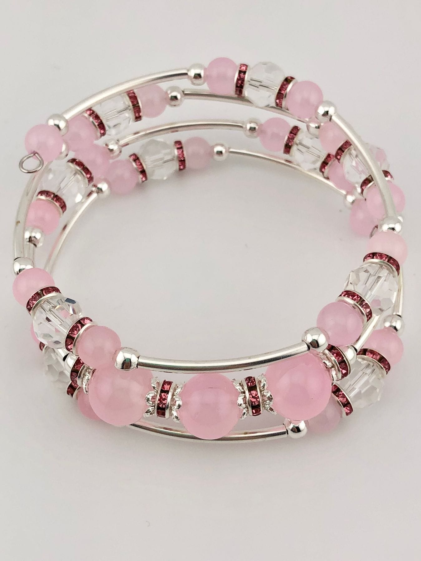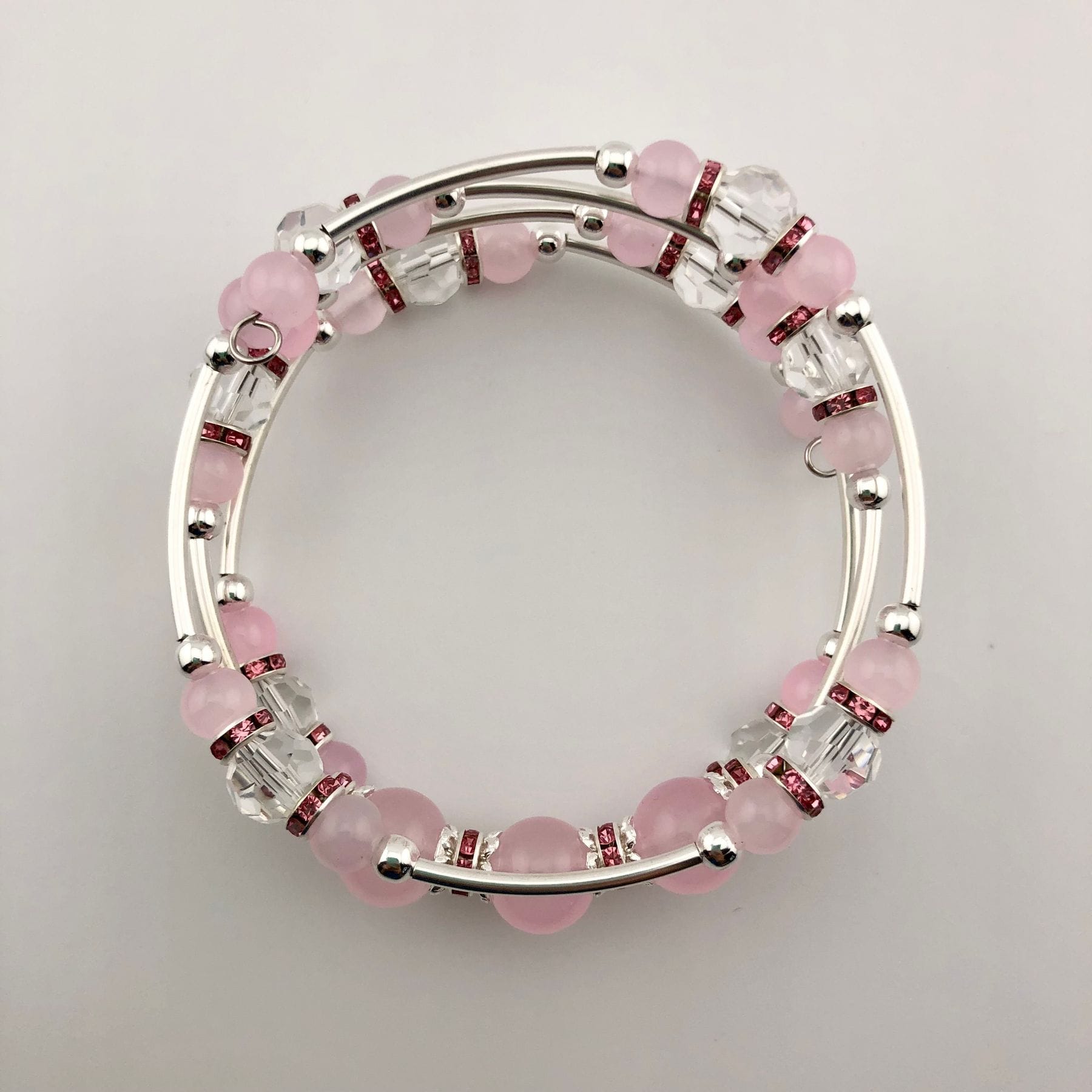Pink and Silver Glass beaded Memory Wire Bracelet with crystal beads and silver tone accents
